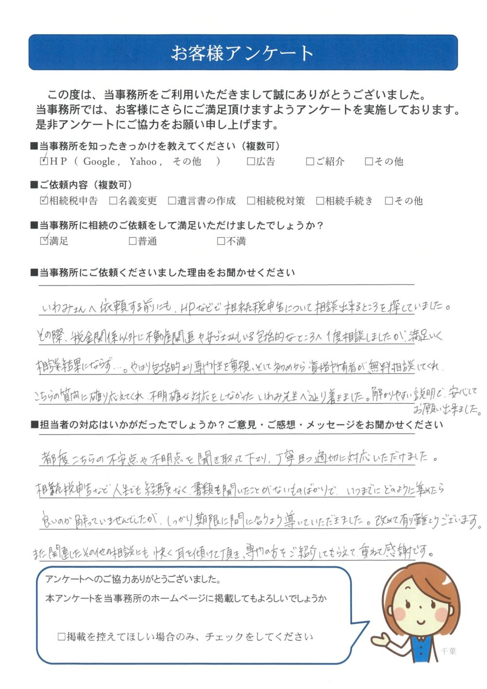 いわみさんへ依頼する前にも、HPなどで相続税申告について相談出来るところを探していました。その際、税金関係以外に不動産関連や弁護士さんもいる包括的なところへ1度相談しましたが満足いく相談結果にならず…。やはり包括的より専門性を重視、そしてはじめから資格所有者が無料相談をしてくれ、こちらの質問にしっかり応えてくれ、不明確な対応をしなかったいわみ先生へたどり着きました。解りやすい説明で安心してお願い出来ました。