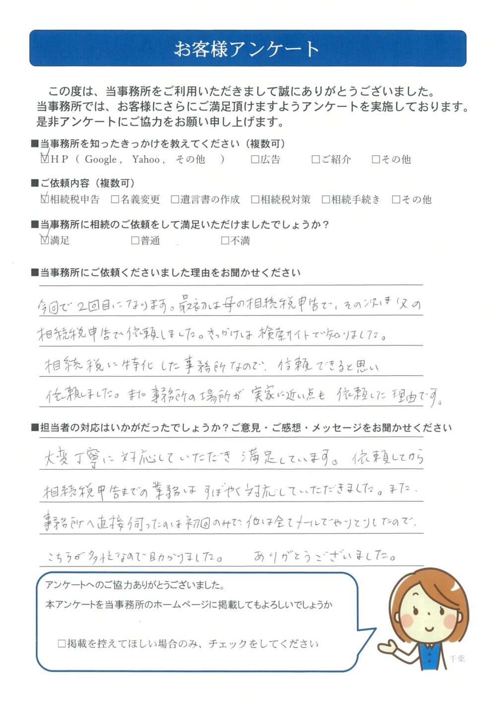 今回で2回目になります。最初は母の相続税申告で、その次は父の相続税申告で依頼しました。きっかけは検索サイトで知りました。相続税に特化した事務所なので信頼できると思い依頼しました。また事務所の場所が実家に近い点も依頼した理由です。