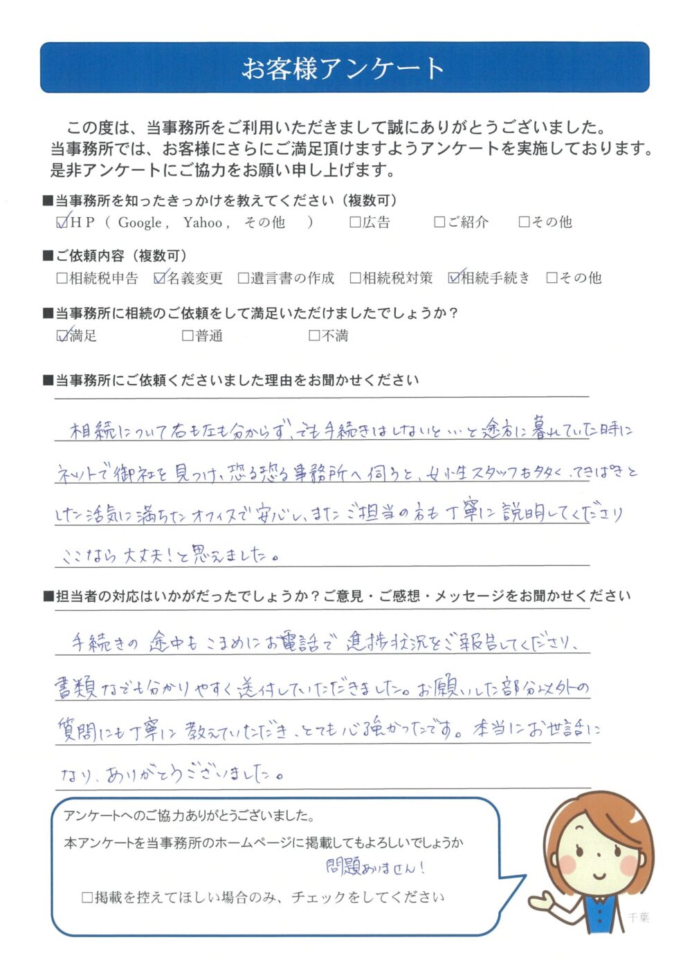 手続きの途中もこまめにお電話で進捗状況をご報告してくださり、書類なども分かりやすく送付して頂きました。お願いした部分以外の質問にも丁寧に教えていただき、とても心強かったです。本当にお世話になりありがとうございました。