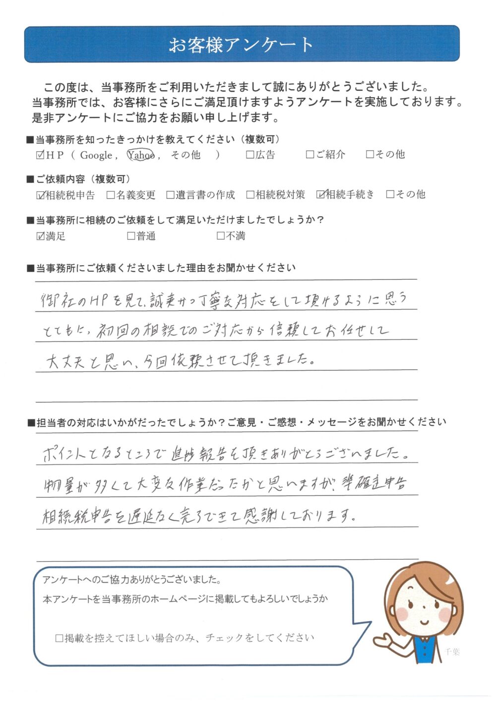 ポイントとなるところで進捗報告を頂きありがとうございました。物量が多くて大変な作業だったかと思いますが、準確定申告、相続税申告を遅延なく完了できて感謝しております。