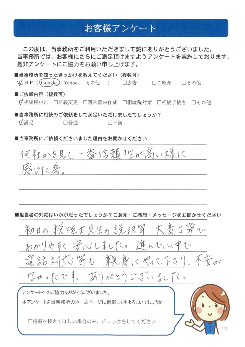 相続税申告|進んでいく中で電話対応等も親身にやって下さり、不安がなかったです。