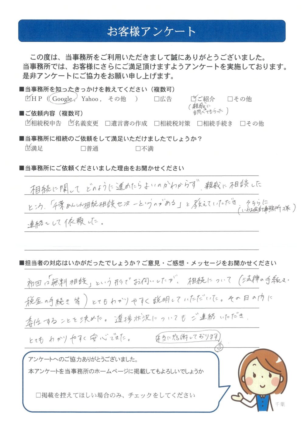 相続に関してどのように進めたらよいか分からず、親戚に相談したところ、「千葉あんしん相続相談センターというのがある」と教えていただき、そちら(いわみ会計事務所様)に連絡をして依頼した。