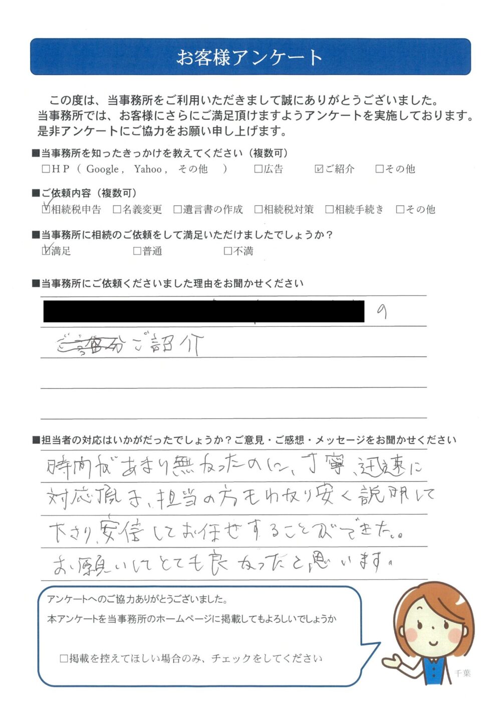 相続税申告|時間があまり無かったのに、丁寧、迅速に対応頂き、担当の方も分かりやすく説明して下さり、安心してお任せすることができた。