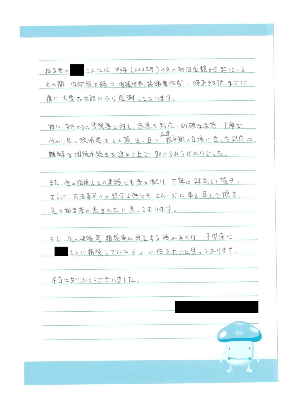 担当の〇〇さんには、昨年(2023年)4月の初回面談から約10ヶ月もの間、仮納税を経て相続分割協議書作成、修正納税までに渡り、大変世話になり感謝しております。