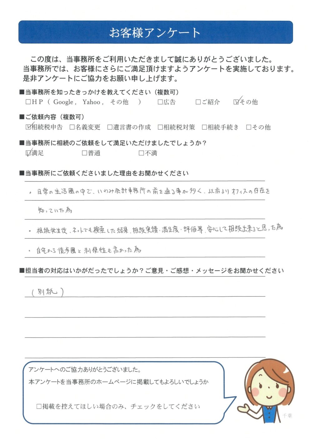 また、他の相続人との連絡にも気を配り、丁寧に対応して頂き、さらに、司法書士への紹介2件にもスムーズに事を運んで頂き、良き担当者に恵まれたと思っております。