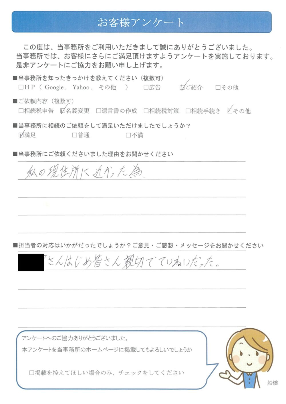 〇〇さんはじめ皆さん親切でていねいだった。