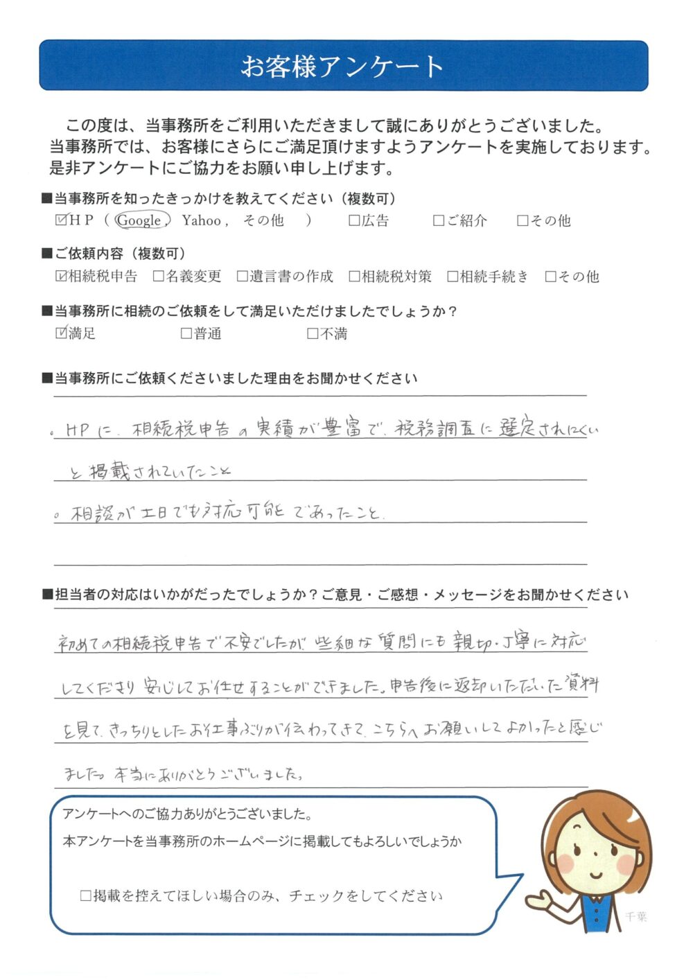 初めての相続税申告で不安でしたが、些細な質問にも親切・丁寧に対応してくださり、安心してお任せすることができました。申告後に返却いただいた資料を見て、きっちりとしたお仕事ぶりが伝わってきて、こちらへお願いしてよかったと感じました。本当にありがとうございました。