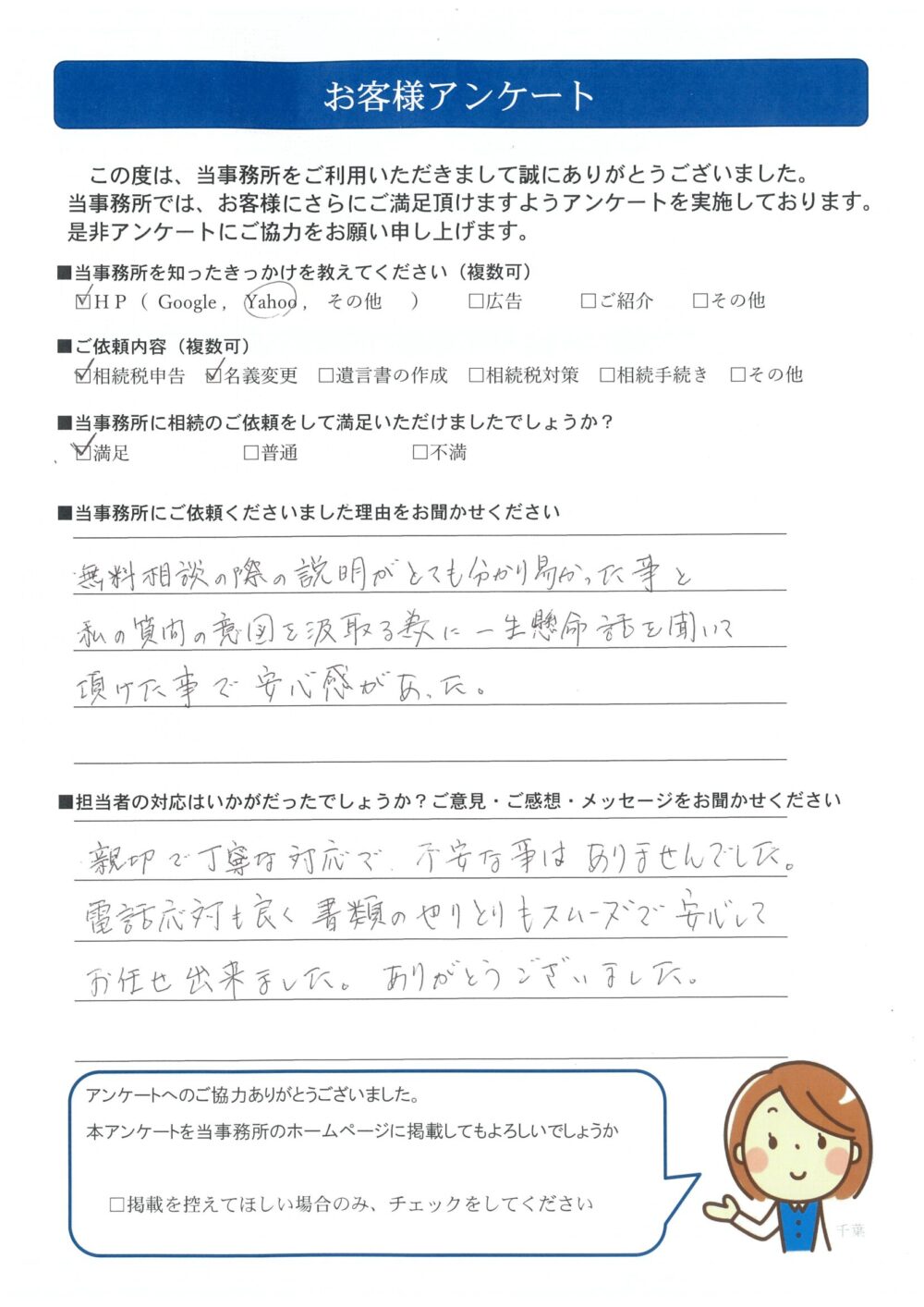 親切で丁寧な対応で、不安な事はありませんでした。電話対応も良く書類のやりとりもスムーズで安心してお任せ出来ました。ありがとうございました。