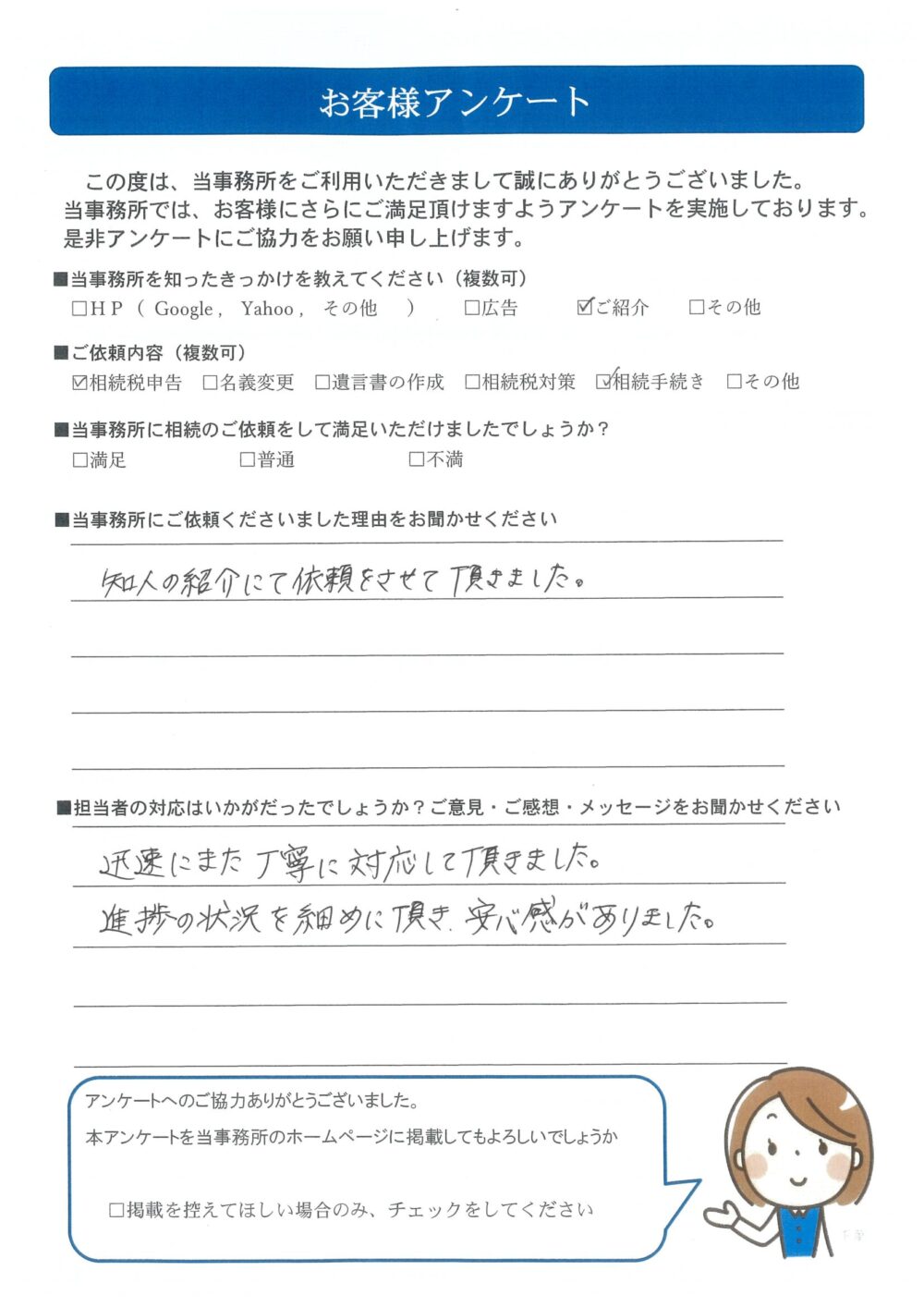 TOP お客様の声 相続税申告・相続手続き|進捗の状況を細かめに頂き、安心感がありました。