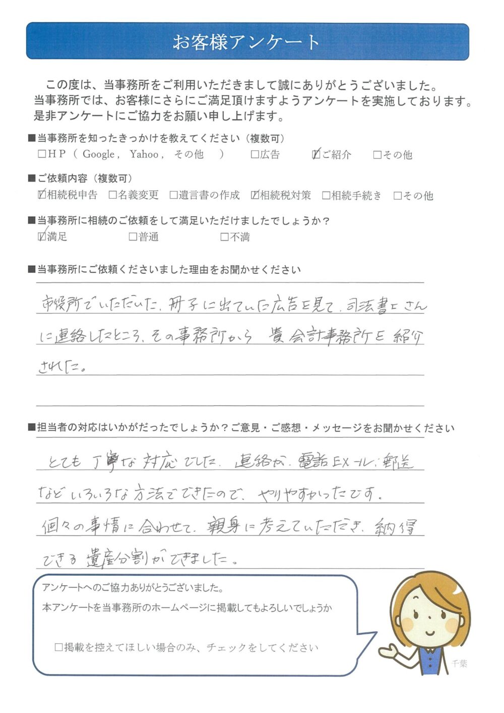 個々の事情に合わせて親身に考えていただき、納得できる遺産分割ができました。