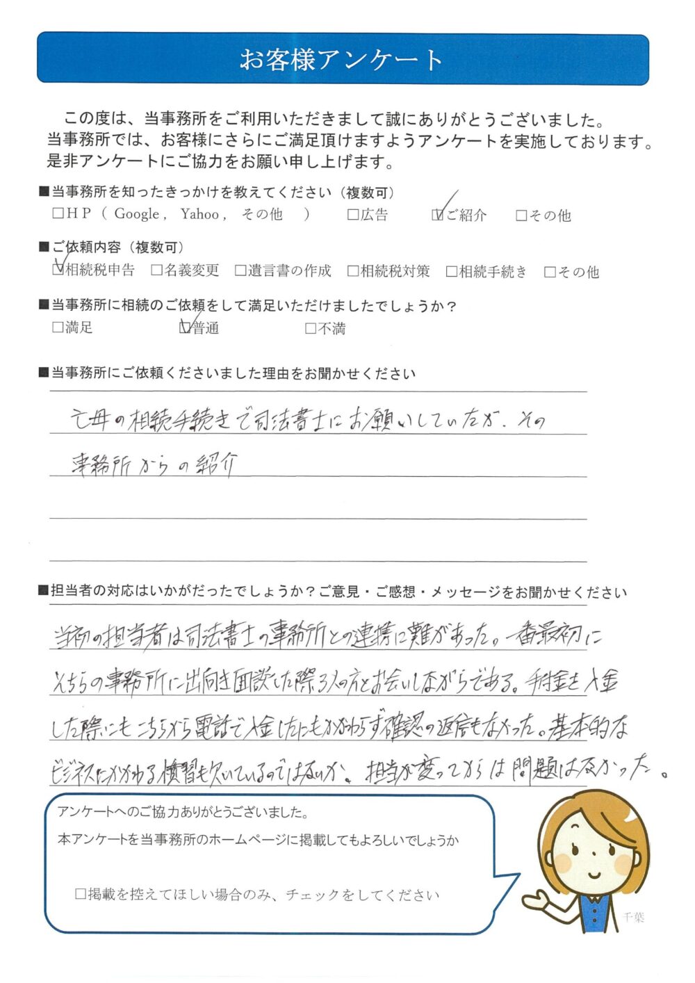 亡母の相続手続きで司法書士にお願いしていたが、その事務所からの紹介