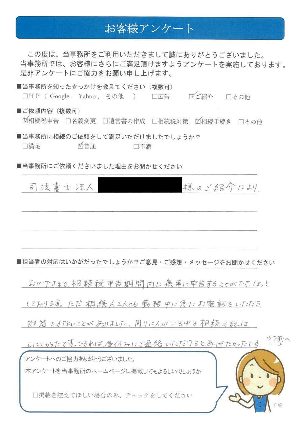 おかげさまで相続税申告期間内に無事に申告することができ、ほっとしております。ただ相続人2人とも勤務中に急にお電話をいただき、即答できないことがありました。周りに人がいる中で相続の話はしにくかったです。できれば昼休みにご連絡いただけるとありがたかったです。